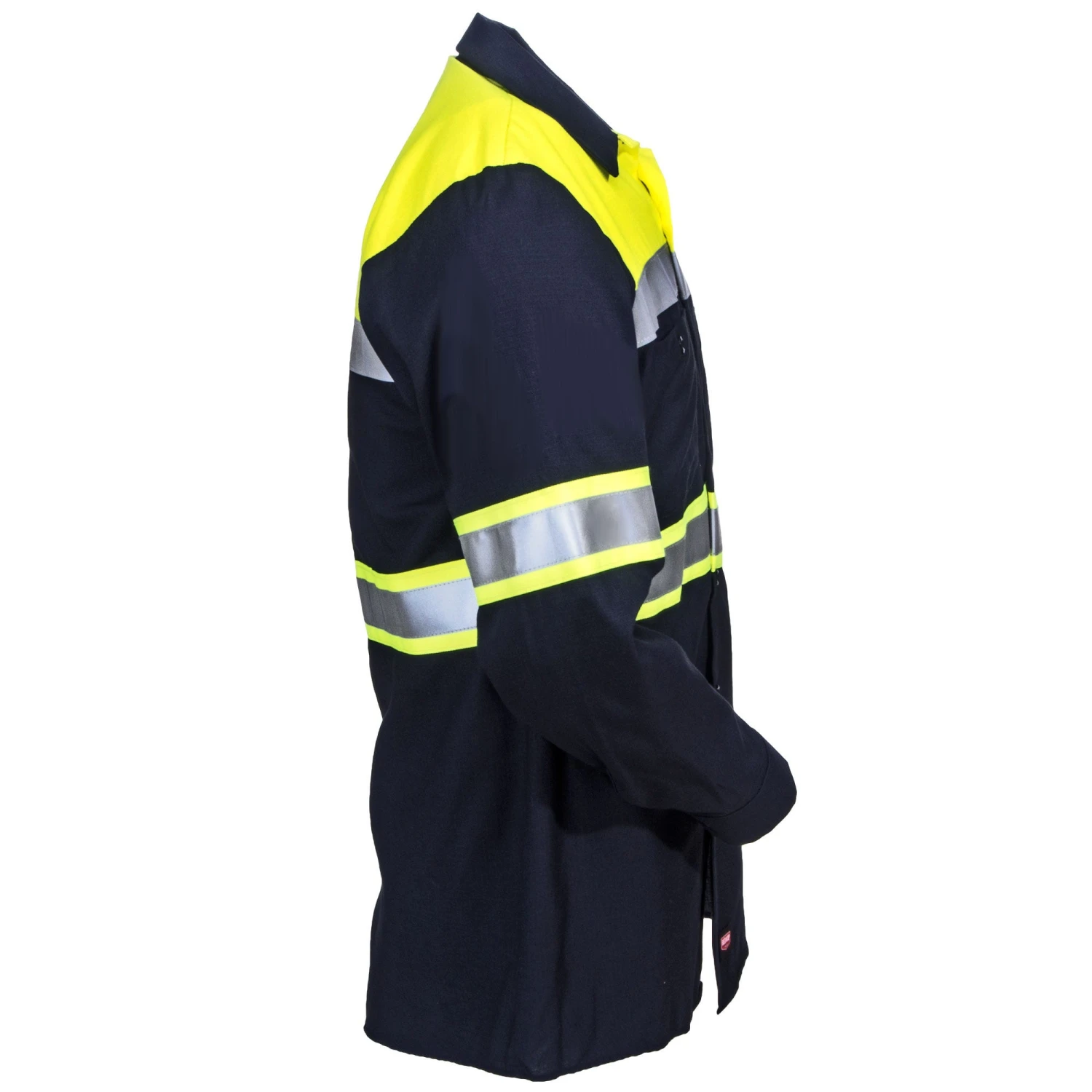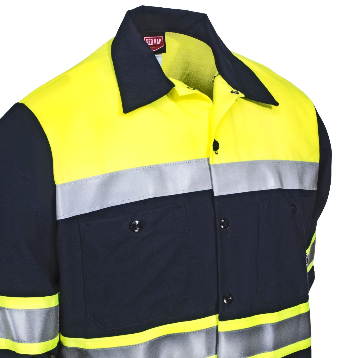 Professional, protective, and safe…you get it all with this work shirt. Red Kap uniforms are ready and willing to deliver when it comes to exactly what you need to get the job done. This durable ~Red Kap Colorblock Ripstop Men’s High Vis SY70 YN Long Sleeve Shirt gives you the high visibility protection you need with a professional button-down long sleeve polo style that also keeps you looking clean and crisp all day long. High visibility yellow color blocks with silver reflective tape against the navy blue Ripstop material is the perfect combination for anyone from foreman to supervisor to crew.